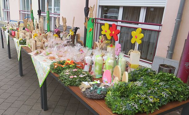 Dieses Jahr fand unser Traditioneller Verkauf von selbstgebastelten Dingen auf unserem Osterbasar am Sonntag 03.04.2022 statt. Das Team des Sozialdienstes bereitet schon zusammen mit unseren Bewohnern Tischgestecke, Kränze und Osterdekorationen vor. Dem Einfallsreichtum waren keine Grenzen gesetzt und so landeten ansprechend drapiert genähte Os-terhasen, verzierte Kerzen, gebackene Osterlämmer sowie vieles mehr auf den Basar-Tischen vor der Einrichtung am Parkplatz. Einrichtungsleiterin Eva Weithmann war voll des Lobes für das Sozialdienst-Team unter Führung von Monika Seidl, die sich um das Zustandekommen des Osterbasars sehr bemüht hatte. Die Einnahmen kommen den Bewohnern zu gute. Es steht dieses Jahr einiges auf der Agenda. Es war trotz kalten Wetter ein voller Erfolg.